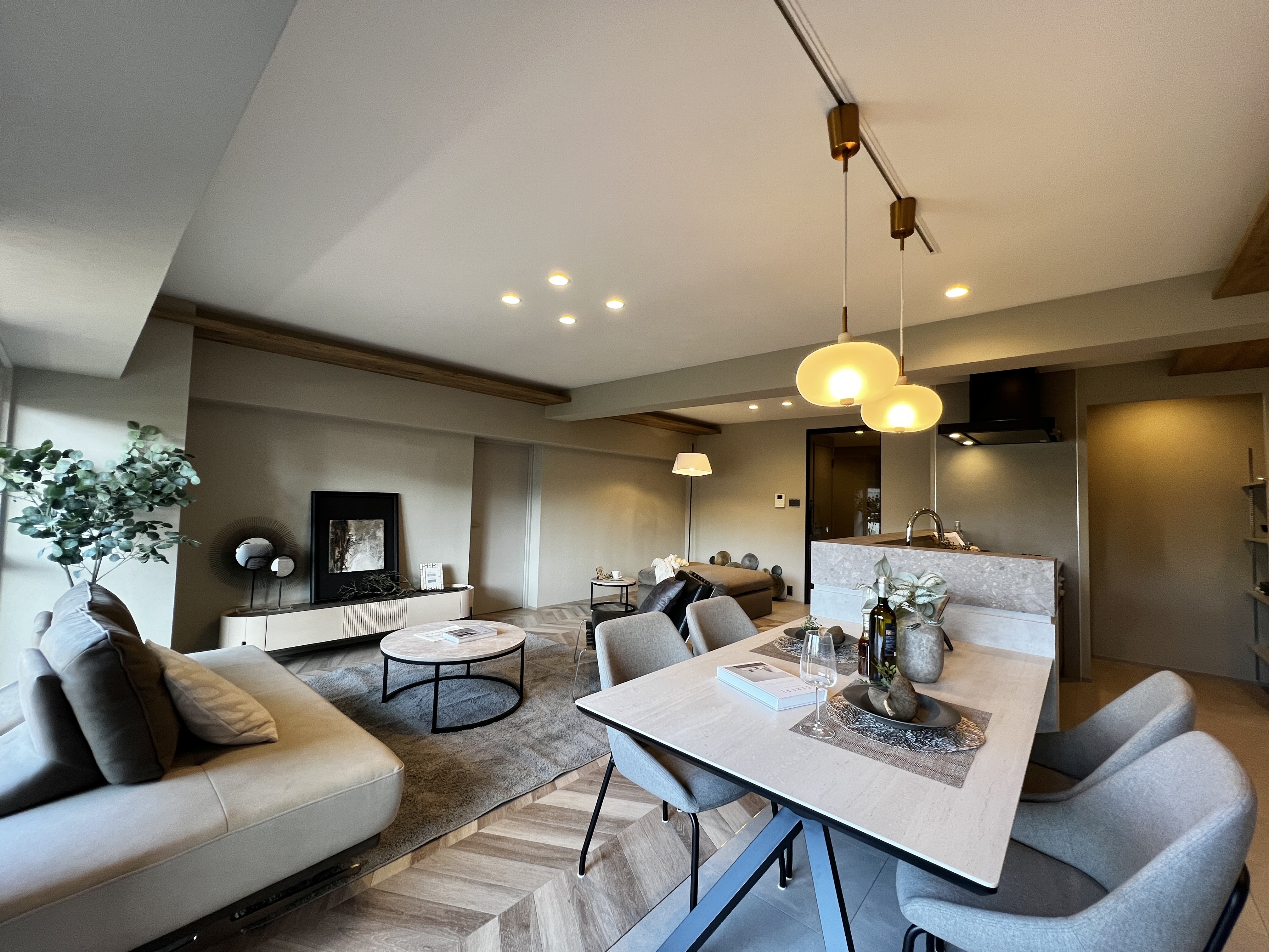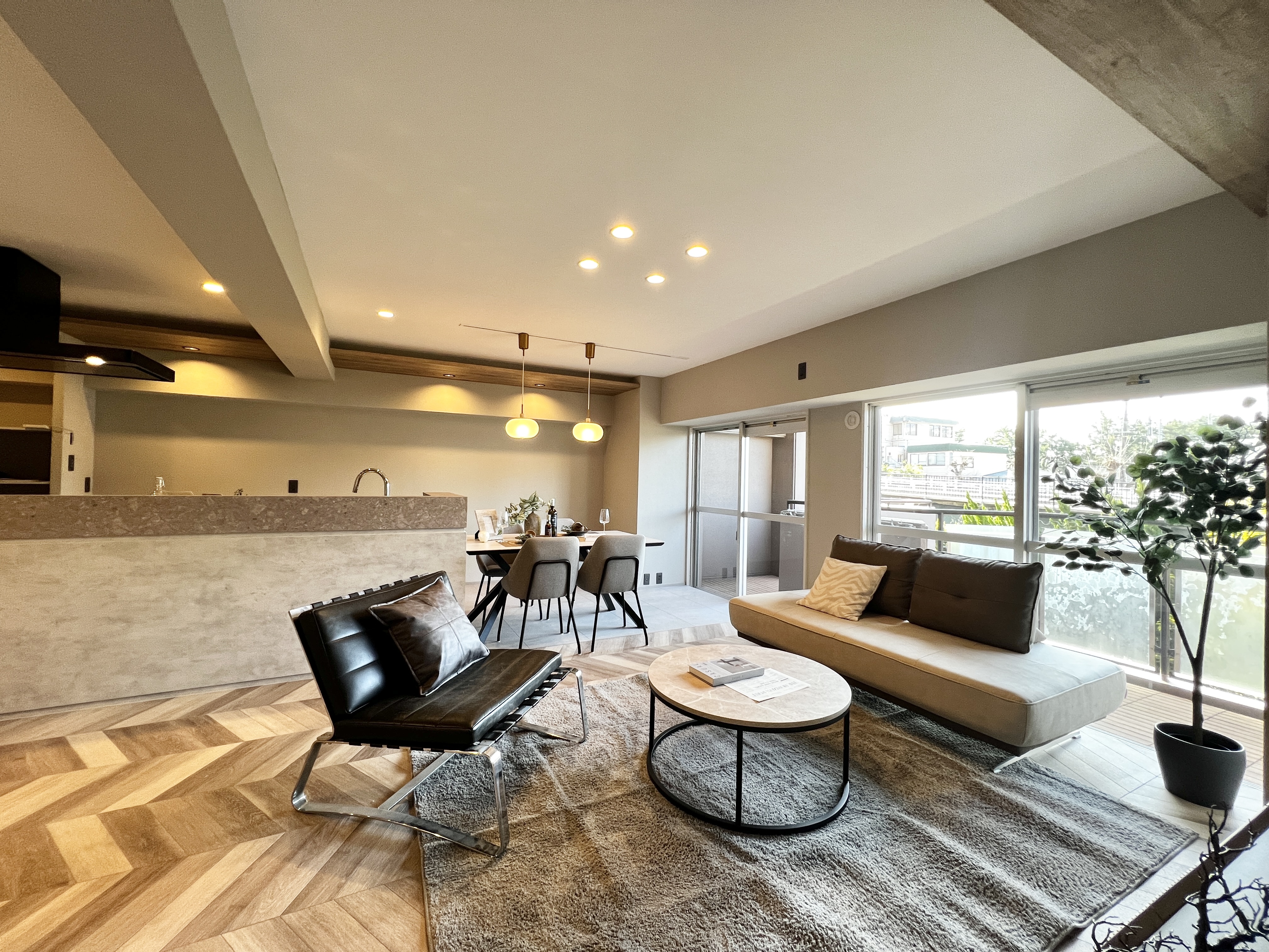 室内はデザイン性の高いリノベーションが施され、約22帖のリビングダイニングは南向きで明るく開放的な空間に仕上がっています。